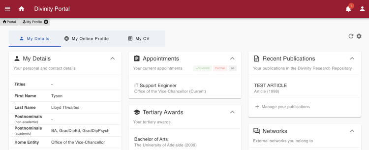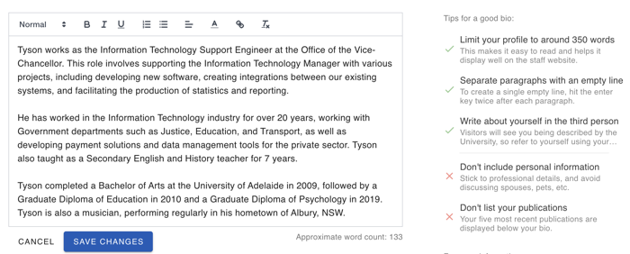 Your staff bio appears as part of your staff profile on staff.divinity.edu.au alongside your profile picture, research output and appointments.